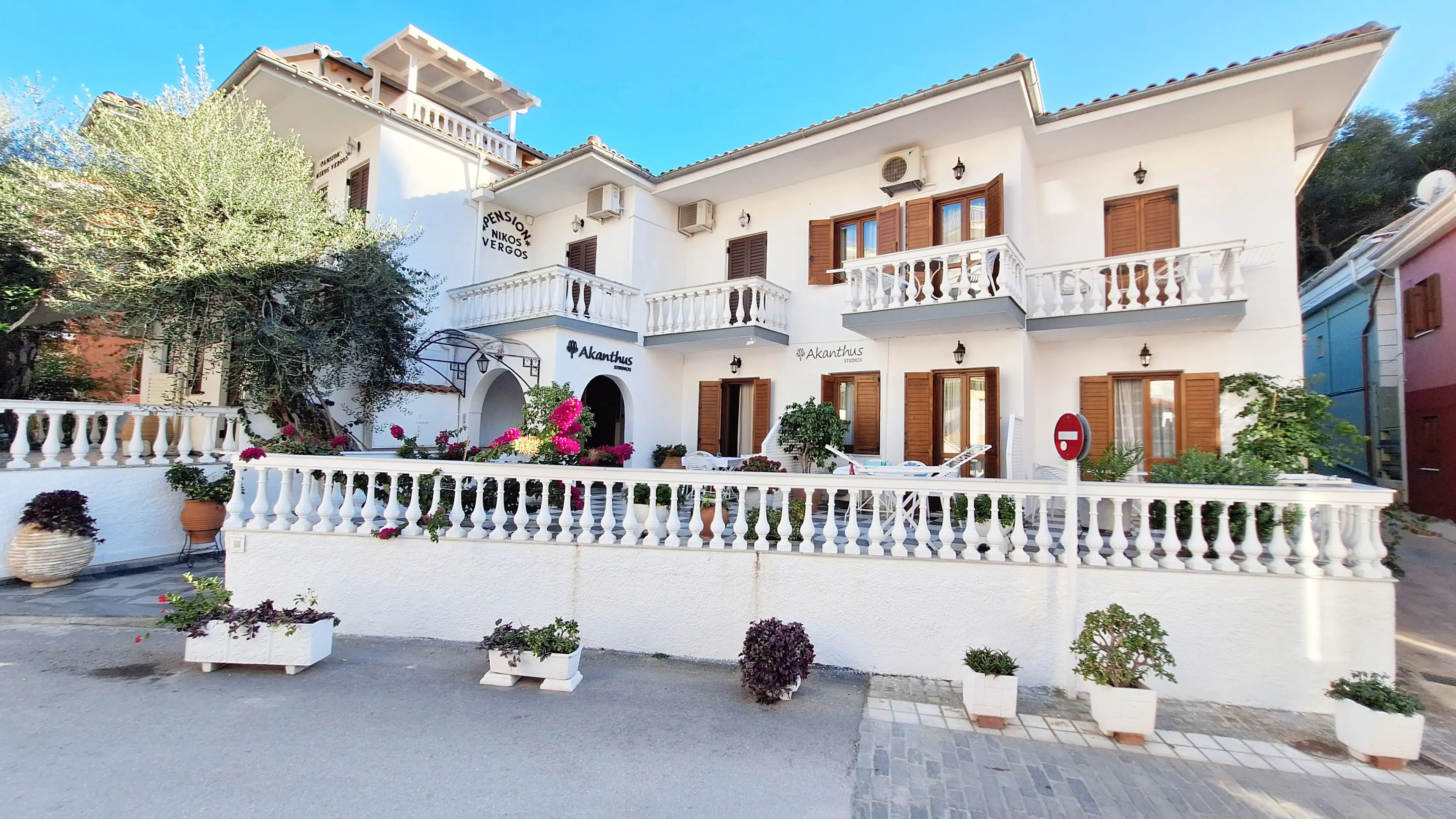 Få skridt fra strandpromenaden og centrum af Parga finder du det charmerende lejlighedshotel, Akanthus Studios, som er bygget i hyggelig, græsk stil med skodder ved vinduerne, søjle-rækværk på balkonerne og med en lille, hyggelig atriumgård i midten. Hotellet huser i alt 14 små lejligheder og er optimalt for dig, der ønsker at holde ferie på et charmerende byhotel kun et stenkast fra stranden.
