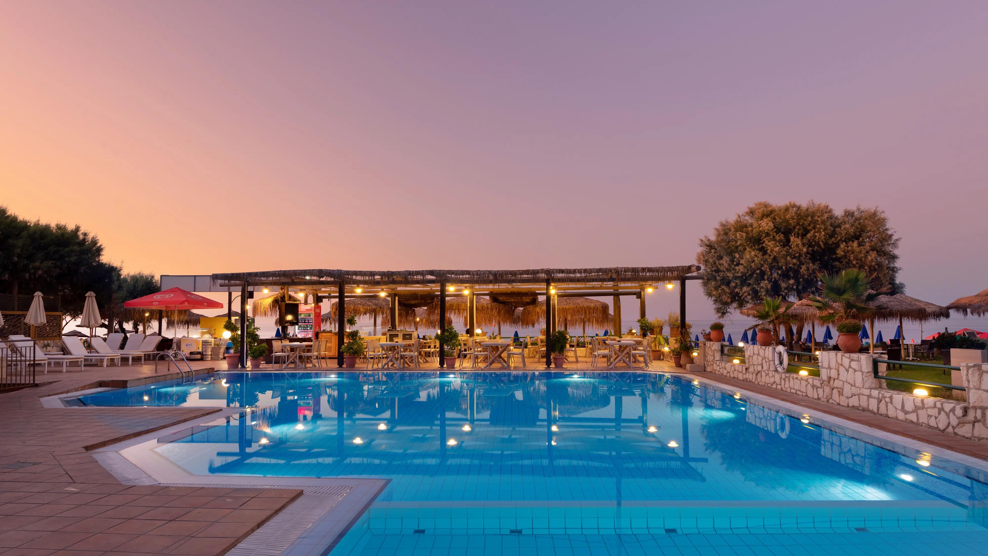 Hotellet har en restaurant, hvor det er muligt at tilkøbe morgenmad, og hvor du blandt andet også kan nyde græske retter eller en stenovnsbagt pizza. Hotellet har også en poolbar, som byder på drikkevarer fra 10.00-21.00.