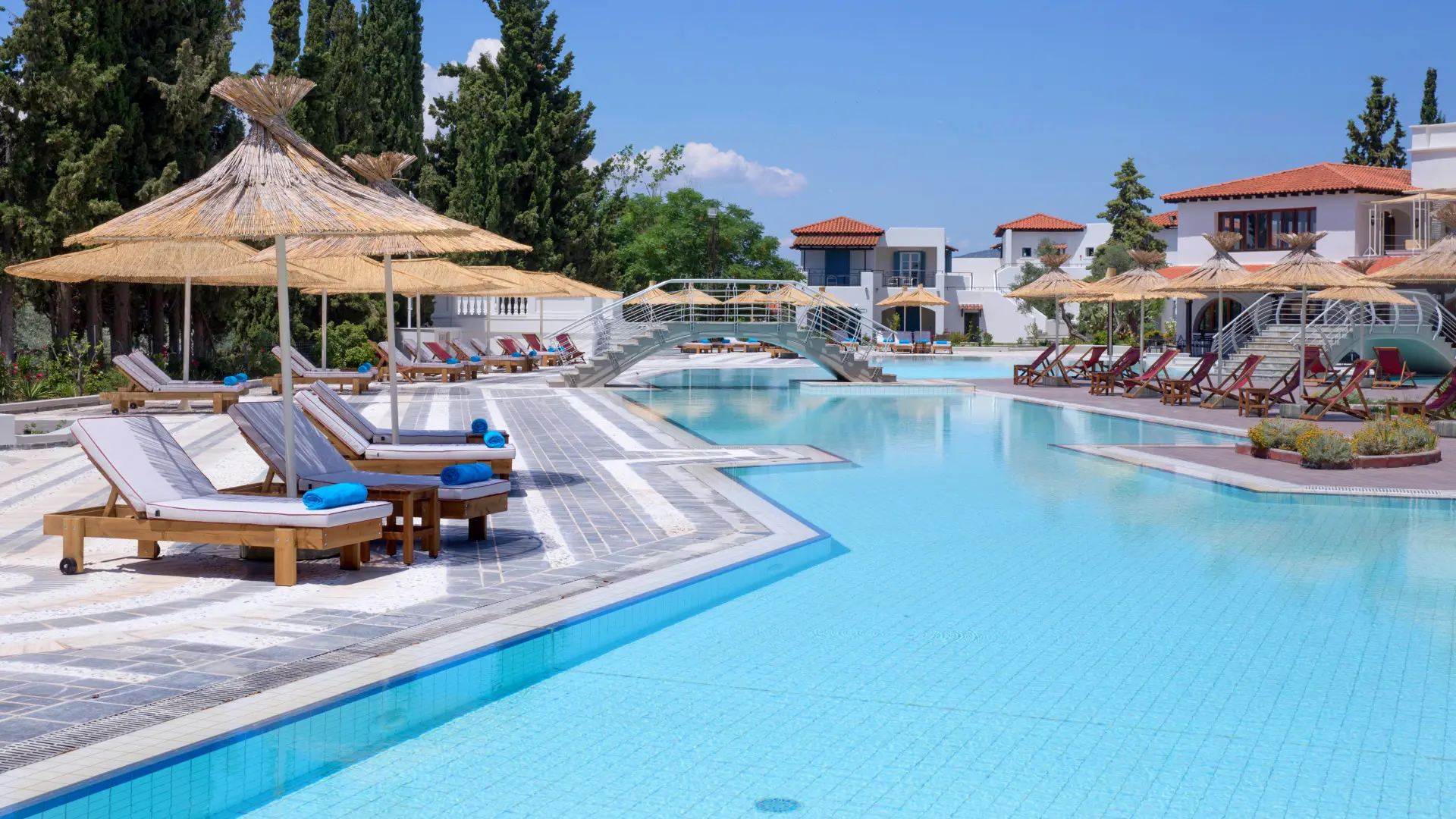 Grønne omgivelser og udsigt over havet. Wellness og en stor, overdådig pool. På Zeus Eretria Resort er der noget for enhver feriegæst. Hvad end du er til afslapning i solen, eller ønsker at få pulsen op på tennisbanen. Det, der er kendetegnende for Zeus Eretria Resort, er den store pool der snor sig gennem poolområdet. Rundt om står liggestole og parasoller til fri afbenyttelse, og der er integreret børnepool, både til de aller mindste og til de lidt større børn.