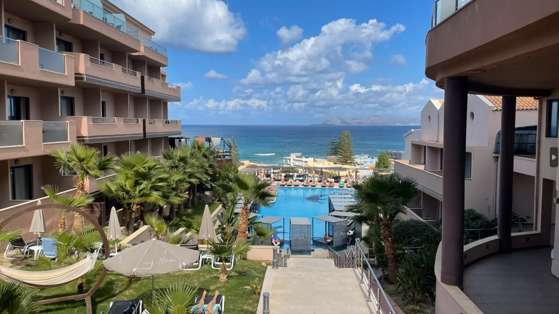 På Hotel Galini Sea View er der en lækker, stor solterasse, hvor hotellets største pool også findes. Herfra er der en enestående udsigt. Fra pool/snackbaren kan man nyde de inkluderede drikkevarer. Hotellet råder over flere barer, indendørs swimmingpool, fitness, sauna og wellness-center med bl.a. frisør og doktorfisk (Nogle faciliteter er mod gebyr). Desuden findes solstole og parasoller ved hotellets mindre poolområde ved stranden, som kan benyttes gratis af hotellets gæster. Liggestole på selve stranden kan lejes mod gebyr. Der er mulighed for leje af strand/pool håndklæder (10 euro pr. uge pr. person).