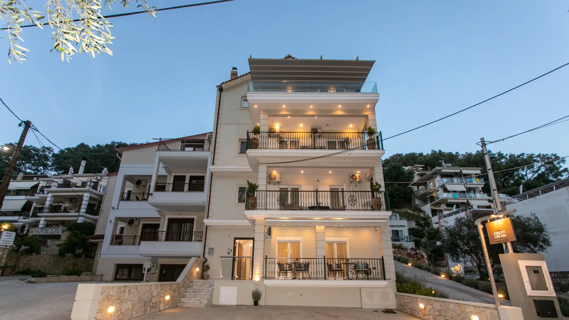 Pargas Dream ligger på en rolig vej omkring 700 meter fra de to smukke bystrande, Krioneri Beach og Piso Krioneri Beach, som begge er populære til badning, snorkling og solbadning. Byens livlige havnefront med dens autentiske tavernaer, caféer og butikker ligger i umiddelbar forlængelse af bystranden, kun 10 minutters gang fra hotellet.