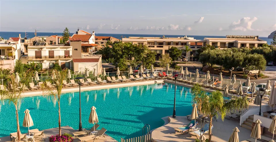 Porto Platanias Village Resort er bygget i typisk græsk byggestil med skønne farverige omgivelser. Indbydende palmefyldt have, stor solterrasse med imponerende swimmingpool og separat børnepool. I 2022 har hotellet endvidere fået etableret egen aquapark med flere vandrutschebaner.