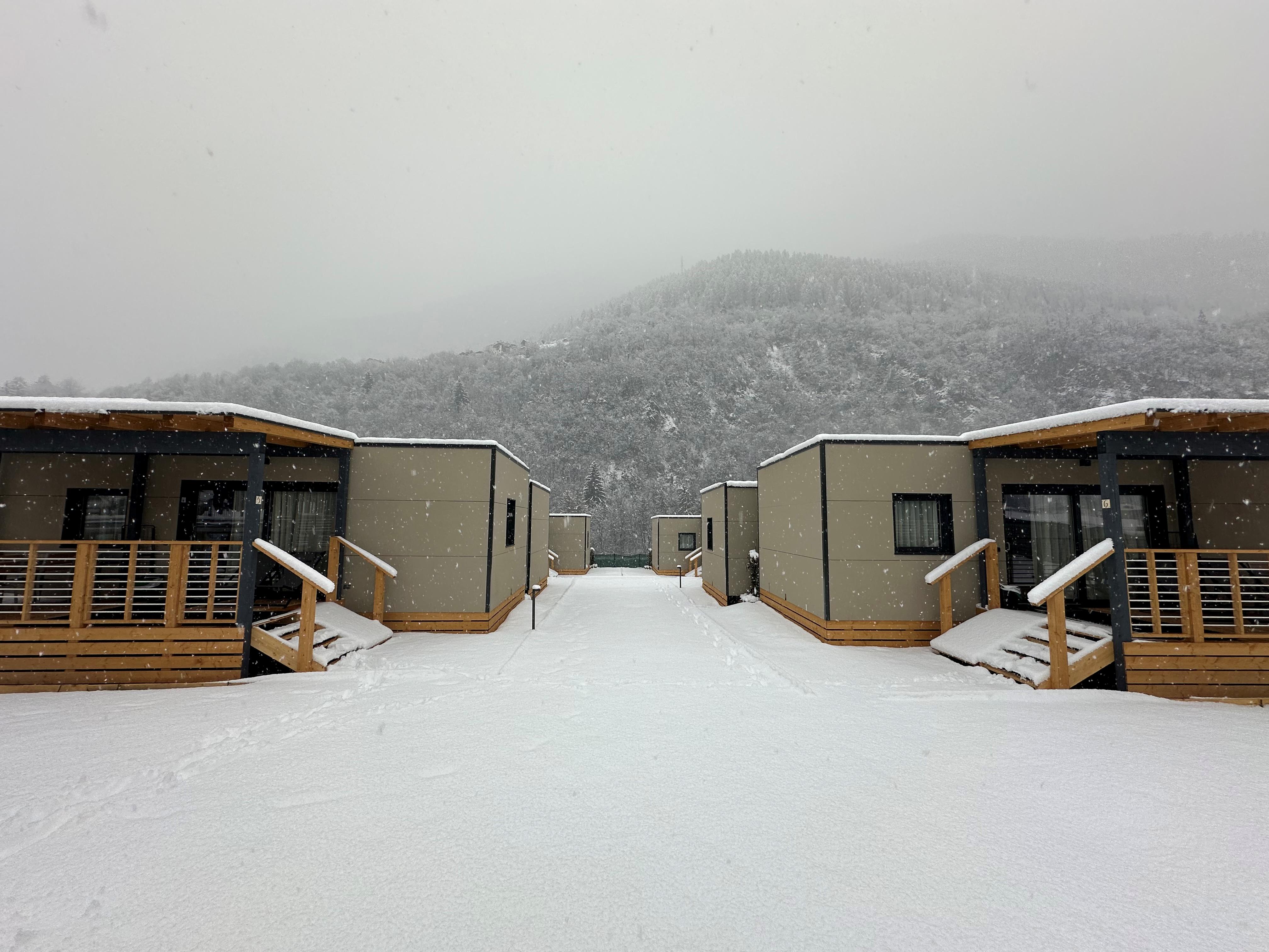 Camping Dolomiti Dimaro ligger i Dimaro, midt i Val di Sole, Italien, og tilbyder en overraskende komfortabel skiferieoplevelse. Her bor du i moderne træmobilhomes, der føles som private chaleter midt i et snedækket bjerglandskab. Skilifterne ligger cirka to kilometer væk og kan nemt nås med den gratis shuttlebus, som stopper lige i nærheden. Mobilhomesene er smart indrettede og bygget med lokale materialer, i tråd med campingens bæredygtige profil. Indendørs er der varmt og hyggeligt med to soveværelser, to badeværelser og en indbydende stue, hvor man samles efter en dag i sneen. Store vinduer lukker vinterlyset ind, og fra terrassen har du udsigt over de hvide Dolomitter, mens træet og de rolige farver skaber en hyggelig stemning.Efter skiløbet kan du opbevare dit udstyr i skiopbevaringen med støvlevarmere, så alt er klar og komfortabelt næste morgen. I nærheden finder du et lille supermarked inden for gåafstand til dagligvarer, så du nemt kan lave mad selv i det fuldt udstyrede køkken om aftenen. Beliggenheden er rolig, lige uden for centrum, men med landsbyen og butikkerne cirka 600 meter væk er alt tæt på.