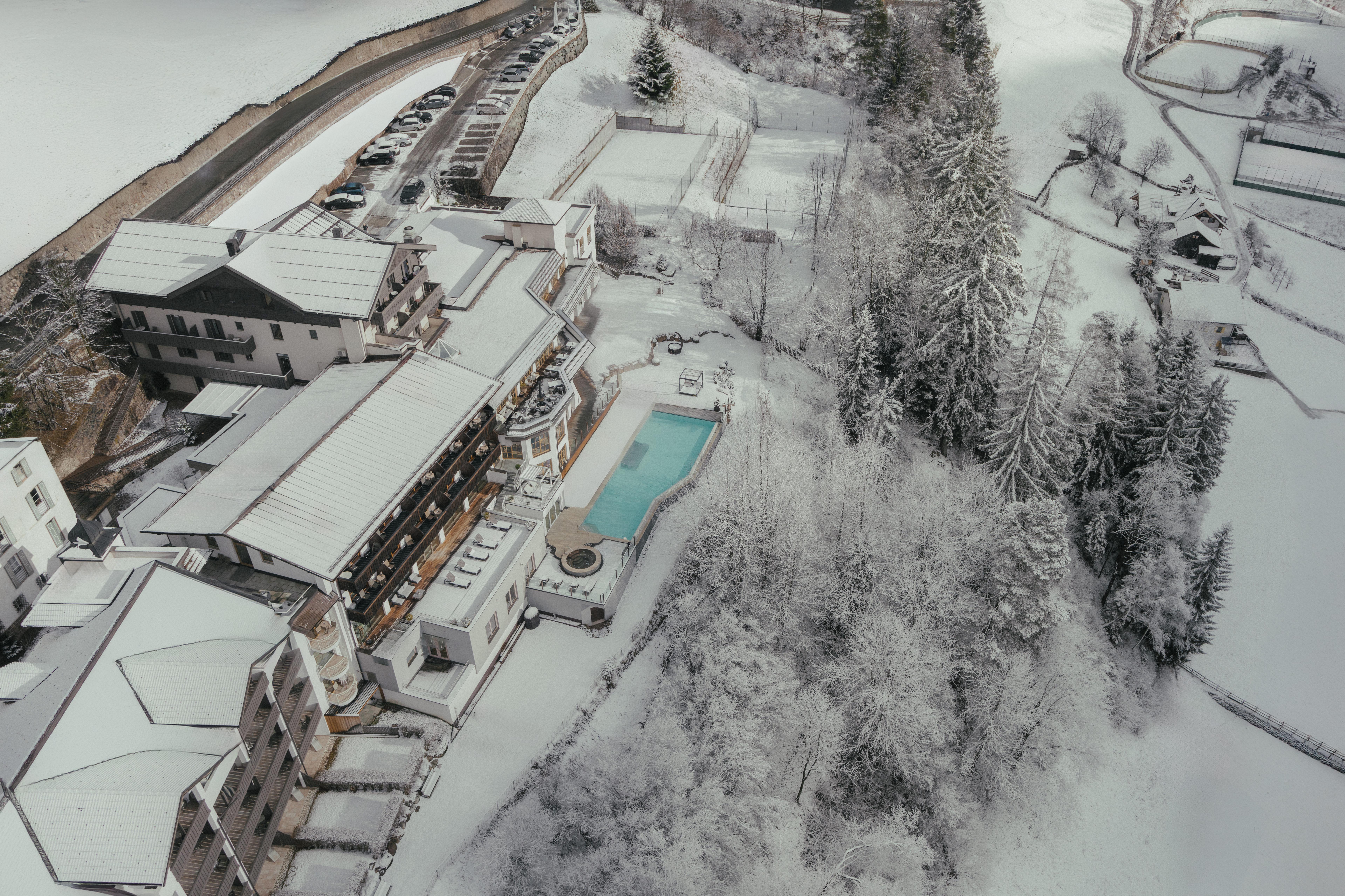 Hotel Engel Gourmet & Spa i Nova Levante, Italien, ligger roligt i det smukke Eggental og byder på en varm, luksuriøs atmosfære med udsigt til skov og bjergtoppe. Efter cirka 800 meter står du ved skiliften eller på pisten, og skibussen stopper kun 10 meter fra døren. Så starter din skitur afslappet og uden besvær.Værelserne og suiterne føles rummelige og moderne, med mange trænuancer, der bringer duften af fyrretræ og natur ind. Du vågner med udsigt til sneklædte trætopper og afslutter dagen indhyllet i blødt sengetøj. Takket være den rolige beliggenhed hører du om natten kun bjergenes stilhed.Det omfattende wellnesscenter på 2.500 m² er en af de store fordele. I de varme saunaer, dampbadet, infinity-udendørs-poolen og jacuzzi finder du et dejligt sted til at lade musklerne slappe af. For familier er der børnebassin, legerum og et godt program for børn og teenagere. Tilstedeværelsen af et skiroom med varme skistøvletørrere gør morgenen ekstra komfortabel.Her bor du på basis af den populære 3/4 Gourmet Board, med morgenmad fyldt med lokale produkter, hjemmelavet kage om eftermiddagen og en udsøgt 5-retters middag om aftenen. Alt tilberedes med omhu af chef Philip Lochmann, så madoplevelsen næsten bliver lige så stor en oplevelse som skiløb.
